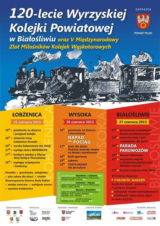 The fifth Zlot Miłośników Kolejek 600mm (600mm Gauge Railway Enthusiasts Rally) was held from 25 to 27 June 2015. The festival visited a different location on each day. On Thursday 25 June the special trains reached Łobżenica for the first time since 2001. On Friday 26 June the trains ran from Łobżenica to Wysoka, and on Saturday 27 June they returned to Białośliwie for the traditional locomotive parade. See also the event poster.