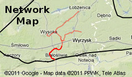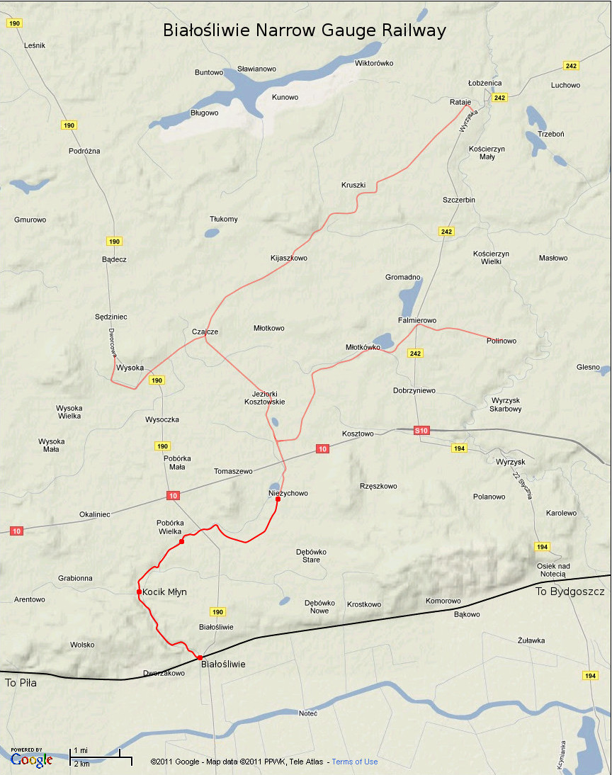 Today only one of the 8 operational bases and sheds remains in use, at Białośliwie. From Białośliwie the surviving line runs north through forest and alongside a small stream to the first loop and intermediate halt at Kocik Młyn, then turns east and continues to climb up through orchards to the next intermediate station of Pobórka Wielka. The line reaches open farmland on the plateau north of the Notec river valley, then turns northward once more to reach the sizeable village of Nieżychowo. Beyond Nieżychowo the line crosses the main A10 road on the level. Immediately north of the road in the village of Zakłady Przemysłowe where there was once a sugar works, there is a triangular junction. The main line continues north while a disused branch heads east to Polinowo. The next junction on the main line is at Czajcze, where a short branch heads south west to Wysoka, and the main line continues north east to the town of Łobżenica. The route was restored through to Łobżenica in time for the 120th anniversary celebrations on 25 June 2015.