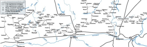 The two railways were formally joined as one system in 1949 and became known as the Bydgosko-Wyrzyskie Koleje Dojazdowe (Bydgoszcz-Wyrzysk Local Railways). At its greatest extent this system was 256 km long and had 8 locomotive sheds and 6 standard gauge interchange points (Białośliwie, Nakło nad Notecią, Witosław, Bydgoszcz, Maksymilianowo and Koronowo). In 1955 the system carried 1,474,000 passengers and 256,000 tonnes of freight. This map shows the full extent of the railway (click to see the map at full size on the BWKD website):