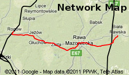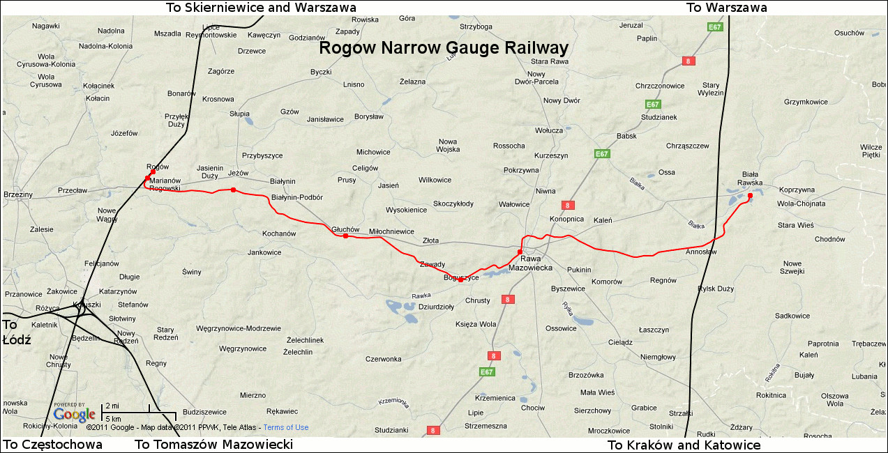 The narrow gauge railway runs East from Rogów, through Jeżów, Głuchów, Boguszyce and Rawa Mazowiecka, to Biała Rawska. Rawa Mazowiecka is on the E67 main road. Close to Biała Rawska the narrow gauge line crosses the standard gauge central trunk line (CMK) on a bridge, though no connection is possible as there is no passenger station on the CMK.
