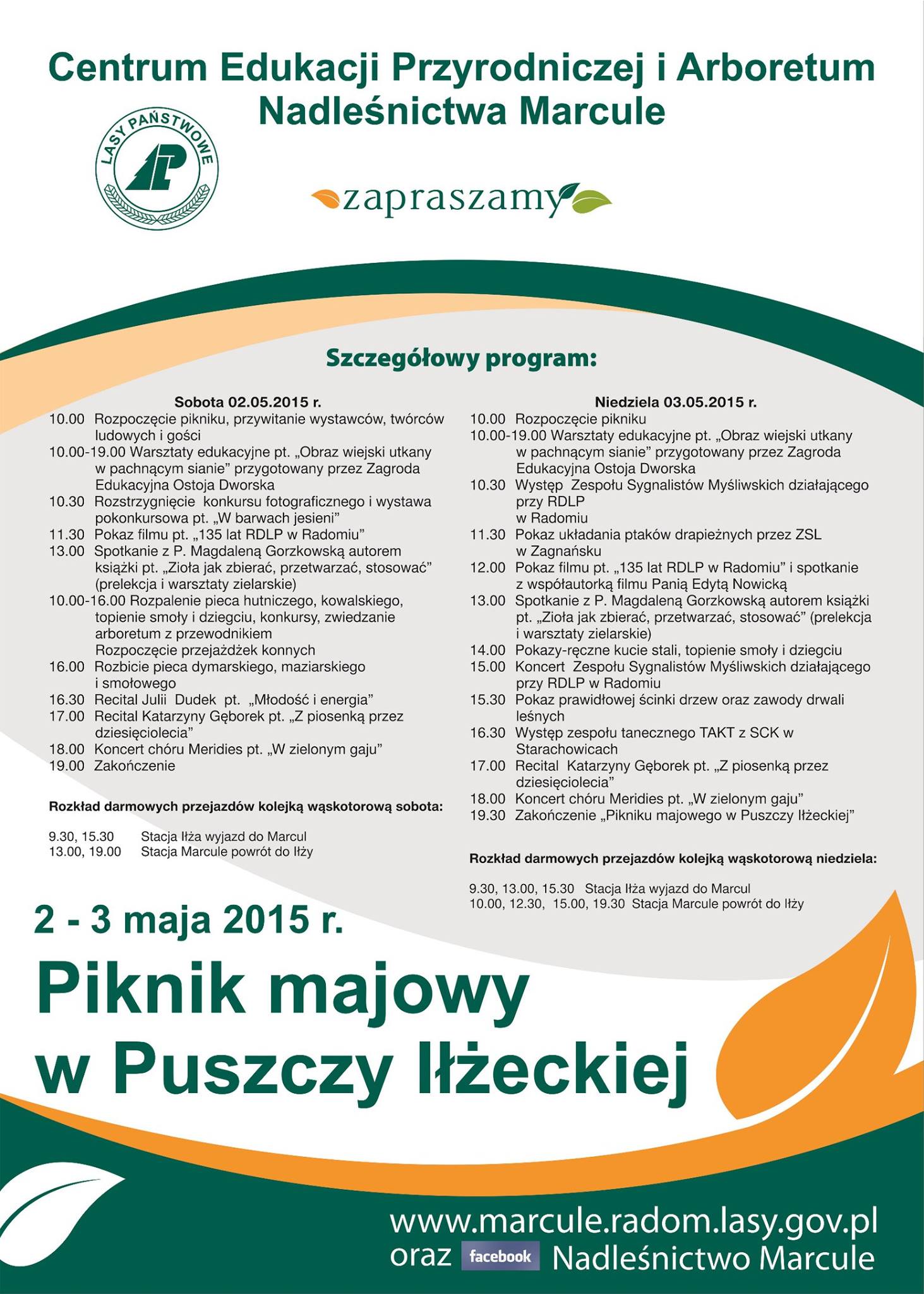 Over the May Holiday weekend, 2 and 3 May, a special timetable will run between Iłża and the arboretum in Marcule. See timetables below and the event poster.