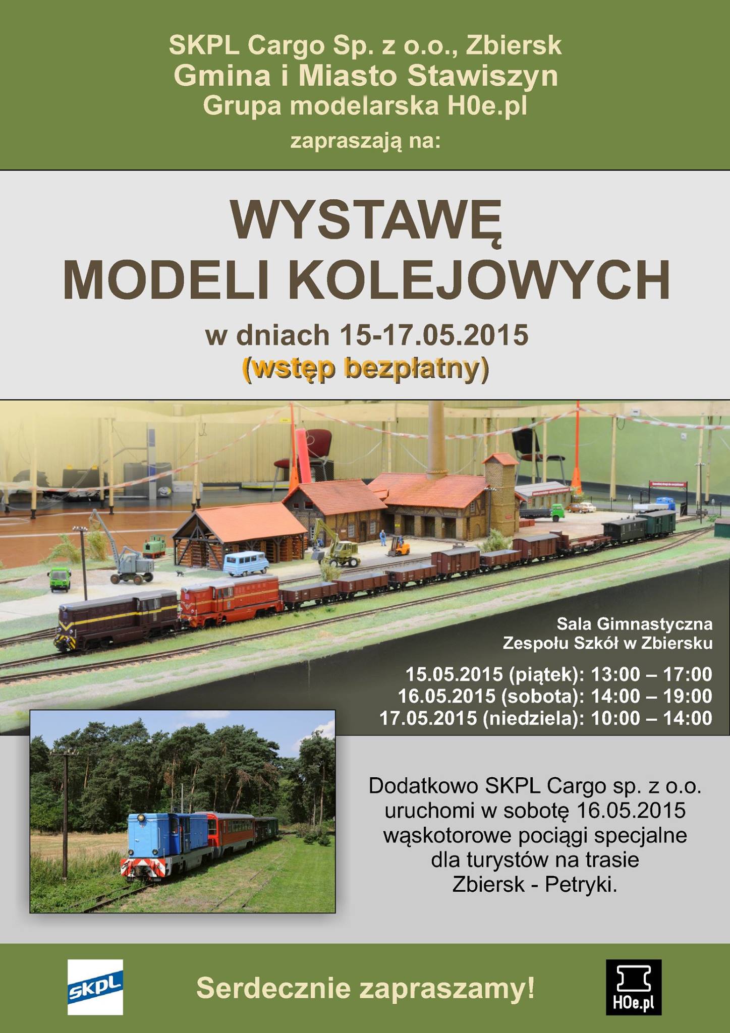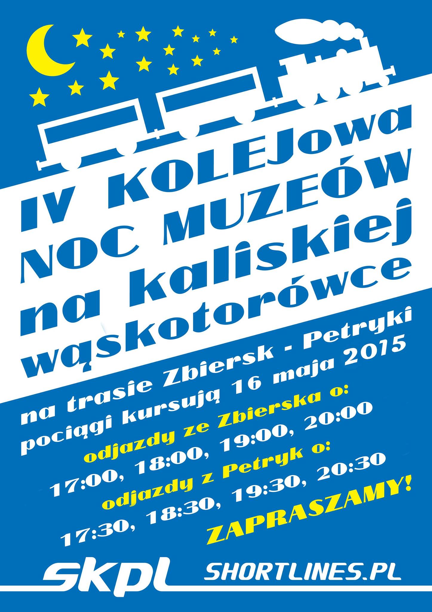 On Saturday 16 May 2015 the Zbiersk narrow gauge railway will take part in Museum Night with trains between Zbiersk and Petryki. Trains will depart Zbiersk at 17:00, 18:00, 19:00 and 20:00. Trains will depart Petryki at 17:30, 18:30, 19:30 and 20:30 (poster). There will also be a model railway exhibition in Zbiersk.